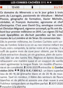 Après les distinctions flatteuses de nos vins par la critique internationale cet été en Angleterre et aux Etats Unis, la sortie le 01 septembre du Guide Hachette 2018 consacre les vins des Combes Cachées. Deux de nos vins y sont en effet très honorablement distingués chacun avec deux étoiles, soit, selon la notation du guide, deux « vins remarquables« … Le Minervois Rouge 2015 y est qualifié de « modèle d’harmonie et de complexité« . Tandis que notre Minervois Blanc Combe Violon 2016 reçoit lui aussi deux étoiles et est qualifié de « blanc superbe »…